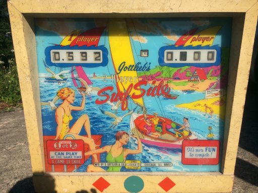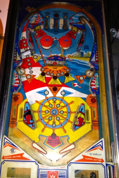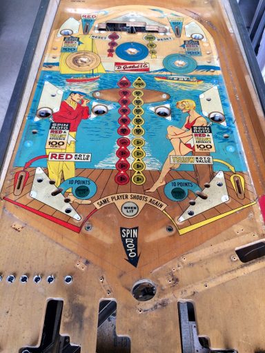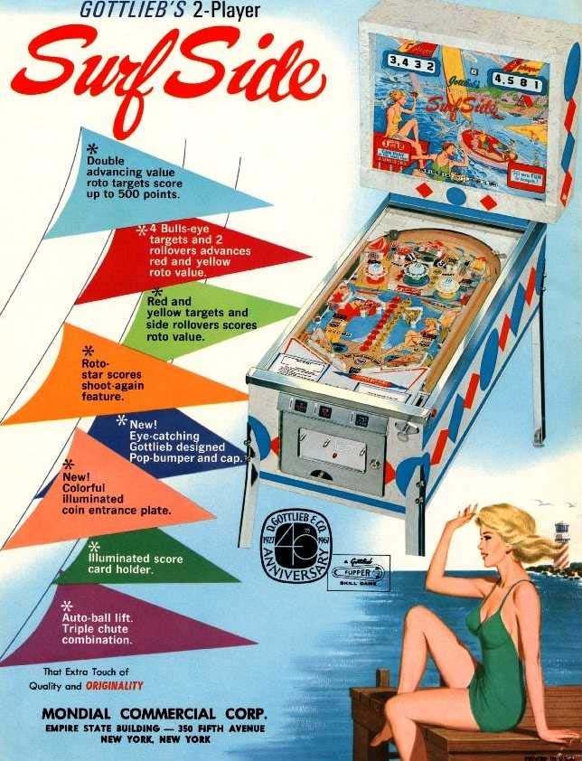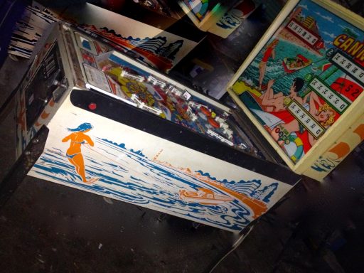 Voci un joli flip des années 60, sur le thème non pas du surf mais du dériveur. A l'instar du Paul Bunyan, on a là un plateau quasiment divisé en plusieurs parties (2), ave un second rang de flipper en mid playfield qui permettent d'aller chercher la roto target (déjà!) en haut et scorer. Un flipper de plus pour témoigner combien il est bon d'être une femme d'après Gottlieb : ellles sonty hilares, comme d'habitude, et me rendent joyeux rien qu'en les voyant. Je me suis surpris moi-même à aimer jouer sur ce flipper!