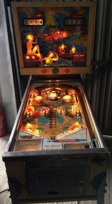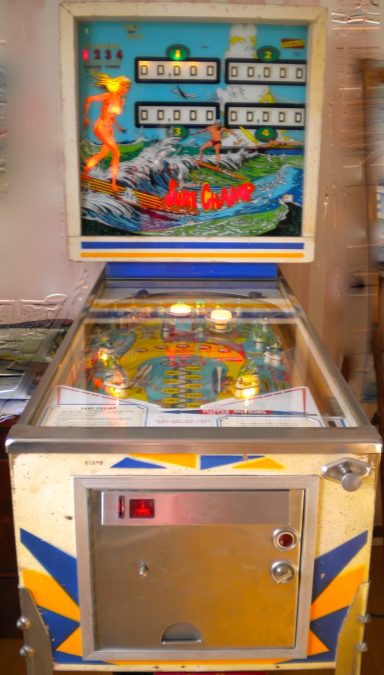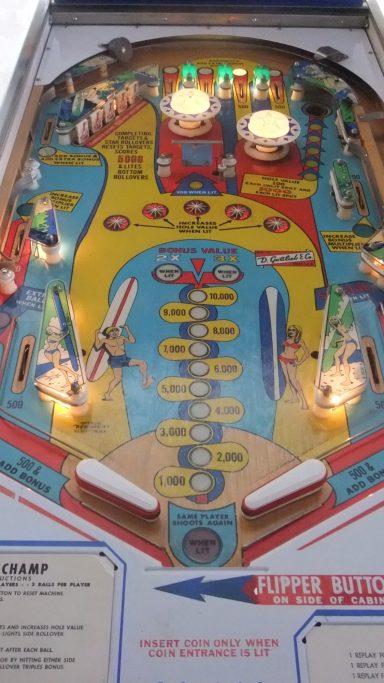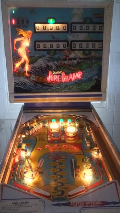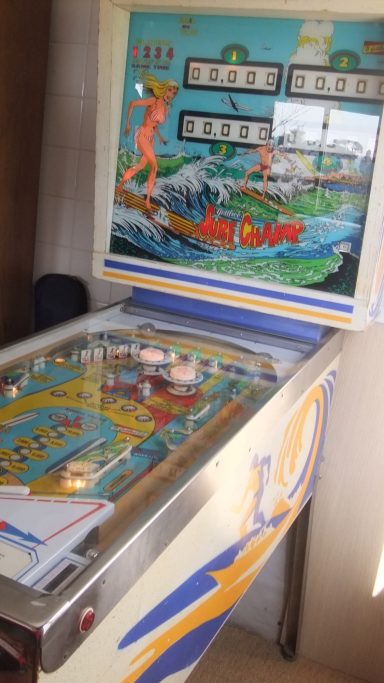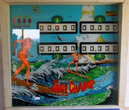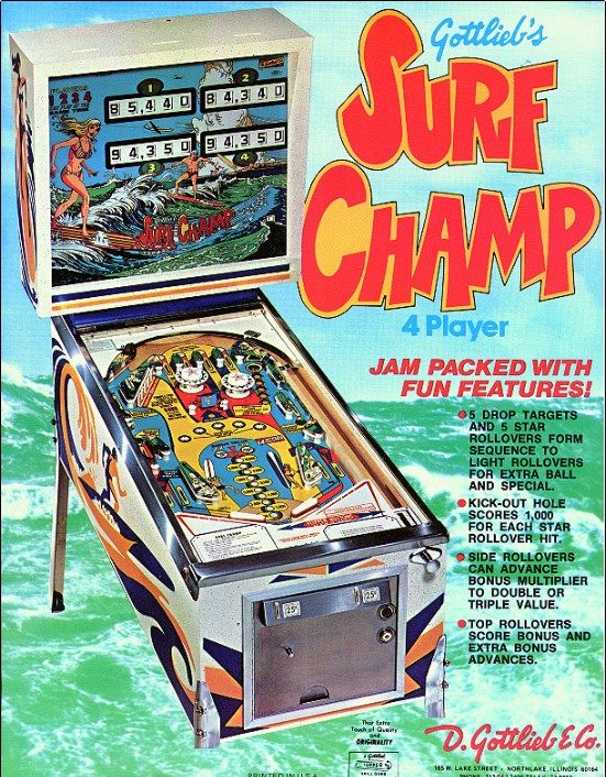 Existe en 2 versions : 4 joueurs (Surf Champ) et 2 joueurs (Surfer). Un flipper que j'affectionne particulièrement : c'est le premier flipper que je me suis offert adulte en souvenir de celui que j'avais dans ma chambre d'ado (un Sheriff). Ca m'a pris comme une envie de p....., et j'ai failli rater mon avion en partance pour l'Inde tellement j'ai attendu la dernière seconde pour l'acheter sur Ebay (350€ à l'époque en 2012). Bien entendu il était vendu "fonctionnant parfaitement" et évidemment il ne marchait pas. J'ai négocié un remboursement de 100€ avec le vendeur, je peux dire aujourd'hui que c'était du coup "une bonne affaire" sauf que personne n'était capable de me le dépanner. 2 ans plus tard et après de nombreuses heures de va et vient entre les forums (merci à Retro flip!) et le flipper, il fonctionnait! C'était le début d'une belle aventure! C'est un jeu atypique et pour ma part, un des meilleurs. J'ai oublié sur la vidéo de préciser que le double bonus est délivré automatiquement en 3eme bille, ce qui fait que l'on peut obtenir bonus X3 (reare voir unique? sur un méca) ! l'astuce pour scorer, bien entendu, est de ne pas tomber dans le piège des drop targets.Je vous laisse deviner la suite...