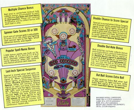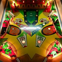 Sans payer de mine, ce flipper cache un jeu très intéressant et atypique. Les 2 bumpers placés en bas du plateau rapellent le Jack in the Box et rendent le jeu assez technique car il n'est pas aisé de viser! j'aime bien le design, bref, un jeu sympathique et un bel objet pour qui aime les années folles.