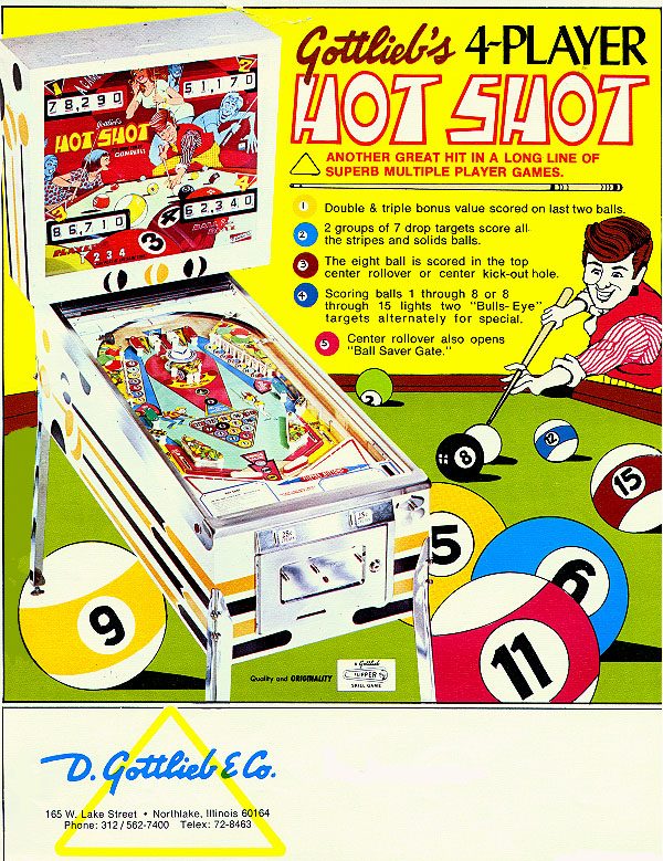 J'aimerais rencontrer quelqu'un de ma génération qui n'a jamais joué sur ce flip. On le trouvait dans tous les bars! Sur le thème du billard, Gottlieb a mis le paquet sur les cibles, comme autant de boules ) "pousser" dans les trous : 15 évidemment! Donc : pas moins de 14 drop tragets et la boule numéro 8 (toujours elle!) : le trou du milieu. j'adore ce flip, parfait pour les enfants car on se retrouve comme au stand de tir!