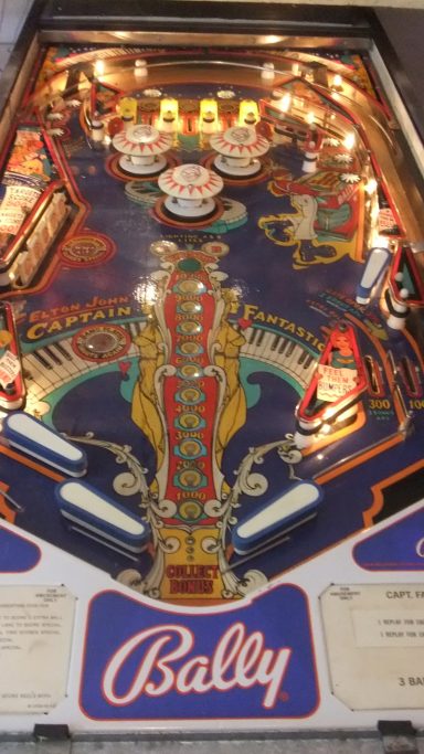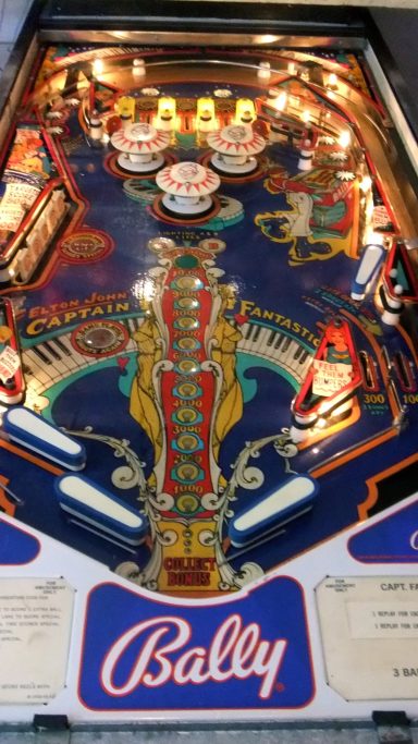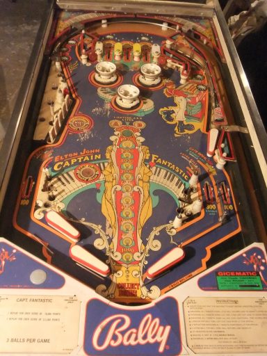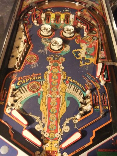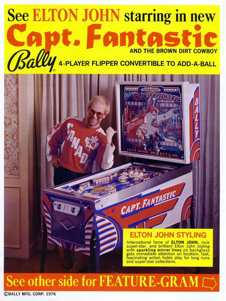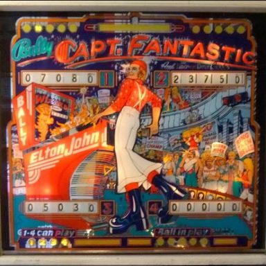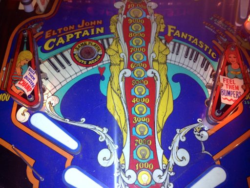 J'ai nommé le Captain Fantastic (and the Brown Dirt Cowboy). Le flipper met en scène Elton John (qui jouait dans ce film que je n'ai pas vu mais qui, de l'avis général, a moins marqué son époque que le flipper lui-même :-), ainsi que tout un tas de personnages hauts en couleurs, en formes (surtout les femmes), et en intrigues (le backglass a lui tout seul est une véritable BD). C'est l'un de mes flippers fétiches, et curieusement je n'ai aucun souvenir d'avoir joué dessus étant ado. Je peux vous dire que je me suis rattrapé depuis! le jeu est juste passionnant, le mieux c'est que vous essayez vous même.