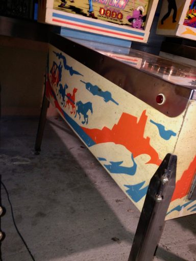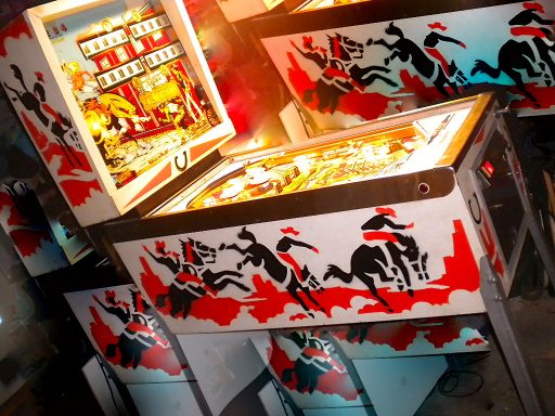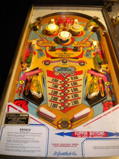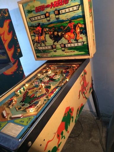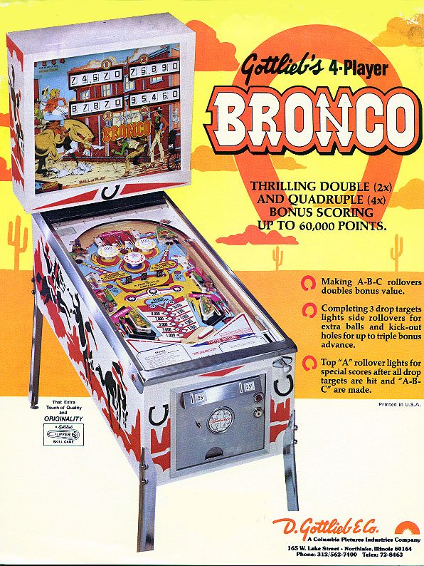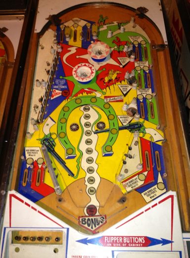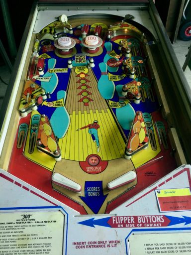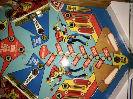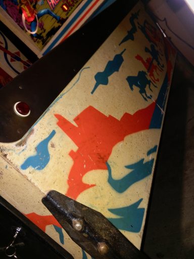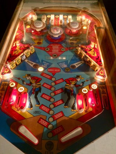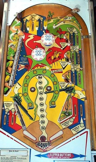 Un autre flip de la série Western. Un Bally cette fois, comme quoi c'est un thème transversal & universel du monde du flipper de cette époque (avant que les films de SF et les super Héros ne prennent le relais pour les flips actuels); J'aime le chenillard qui fait grimper les inserts du milieu grâce au spin targets, et la possiblité de collecter le bonus en cours de partie, si cher à bally, qui rend le flip attractif. J'aime bien aussi avoir à allumer les bumpers (précurseur du Kiss)... a vous de trouver comment!