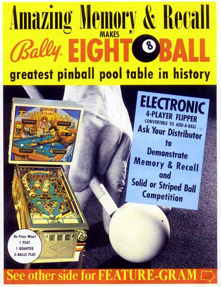 Absolument mythique, peut-être le flipper sur lequel nous avons TOUS joué un jour ou l’autre, toutes générations confondues : Le 8 ball de chez Bally!